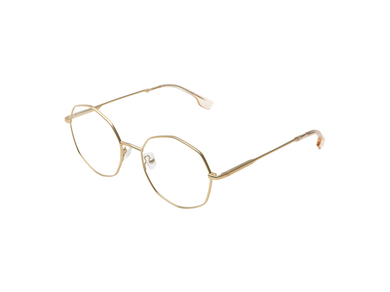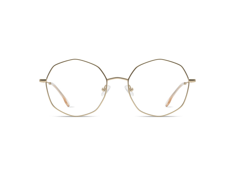 Always has two colored fronts and two acetate fronts. Two classical colors and two contrasting colors. Always combined with a metal color. Very unique shape, round but angled like an octogon. Interesting take on a round shape.