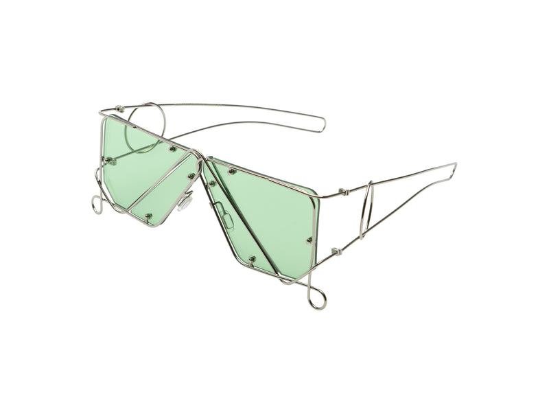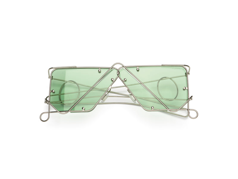 Gabrielle's ephemeral collection celebrates childhood pursuits as rites of passage, highlighting the imaginative ways we entertain ourselves, like turning a string into a cat's cradle or folding paper airplanes. Her sunglasses design is inspired by Beatnik artist Harry Smith's String Figure archive, a universal game of loops and knots that serves as a hand dance, learning tool, and storyteller. Fascinated by the endless variations a continuous piece of string offers, Gabrielle aims to merge facial features with overlapping wires to create facial jewelry.